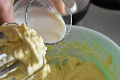 - Ajouter le lait mélangé à l'extrait de vanille (lait de coco pour moi). Battre rapidement pour l'incorporer.