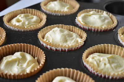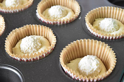 - Verser une cuillère à soupe de préparation dans les moules à cupcake, déposer un Raffaello et remplir au 3/4 les moules.