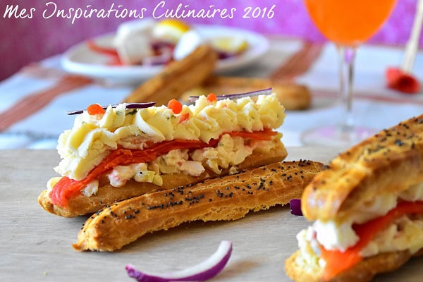 Ces éclairs au tartare de saumon sont très esthétiques et gustativement délicieux, on peut les présenter en entrée froide c’est d’ailleurs la saison, ou les servir à l’apéritif dans ce cas dresser de petits éclairs.