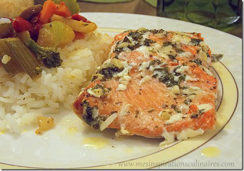 | Dans la recette originale on fait cuire le saumon en papillote durant 45 min mais je préfère cette version. |