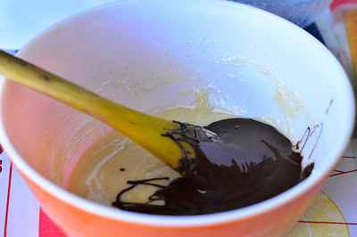 - Verser le beurre noisette tiède et mélanger bien. Ajouter le chocolat fondu et homogénéiser le tout.