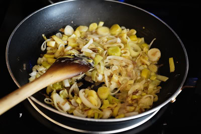 Préparer la garniture en faisant revenir dans une poêle avec du beurre et des poireaux.
