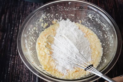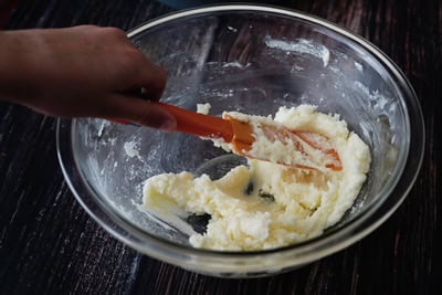- Dans un saladier, mélanger ensemble le sucre et le beurre mou.
