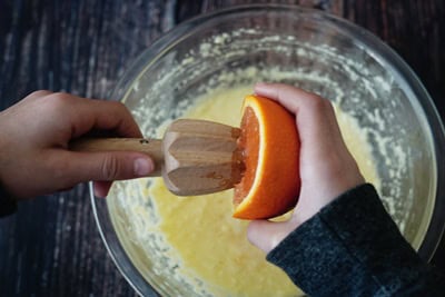 Incorporez le jus d’orange ainsi que le zeste. Mélangez délicatement pour bien parfumer la préparation.