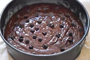 Versez la pâte dans le moule, lissez la surface puis parsemez de pépites de chocolat pour encore plus de gourmandise.