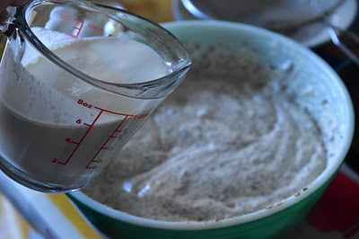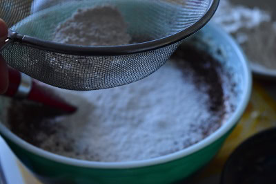 - Ajouter la farine en la tamisant petit à petit au dessus du saladier tout en l'incorporant à l'aide de la spatule.