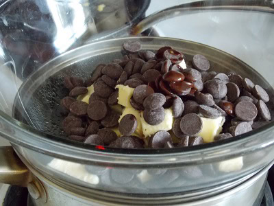 - Pendant ce temps, mélanger le beurre, le café et le chocolat dans un saladier résistant à la chaleur.