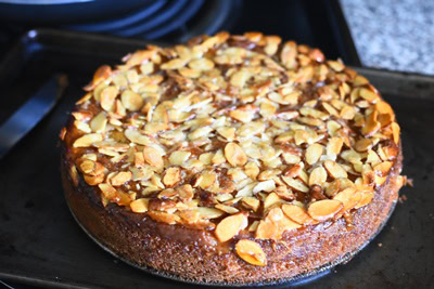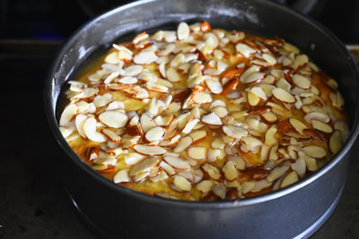 - 2 eme étape : Pendant ce temps, on prépare la garniture en faisant fondre le beurre et en le mélangeant au sucre et aux amandes effilées. On verse ce mélange sur le gâteau aux pommes et on poursuit la cuisson jusqu’à obtenir une belle surface dorée.