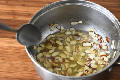 - Ajouter le rhum (le jus de pomme) et les amandes effilées.
