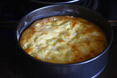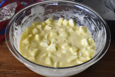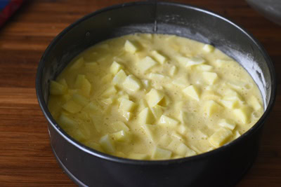 - Incorporer les pommes, verser dans le moule (j'ai utilisé un moule de 21 cm) et enfourner pour environ 35 minutes.
