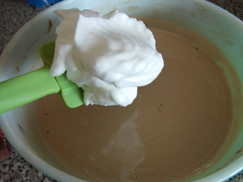 Incorporer les blancs en neige en 3 fois dans le 1er saladier délicatement à l’aide d’une spatule jusqu’à incorporation totale des blancs.