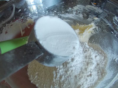 Battre le beurre et le sucre glace jusqu’à consistance légère et mousseuse. Incorporer la farine ainsi que la fécule de mais ou la farine de riz.
