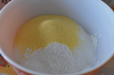 Dans un saladier, versez les ingrédients secs (farine, sucre, farine de maïs, sel, levure chimique).