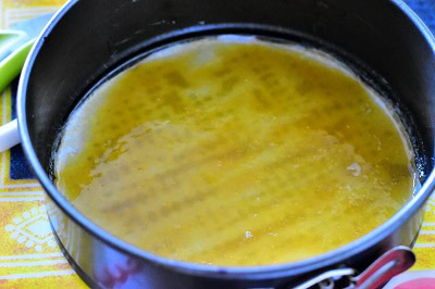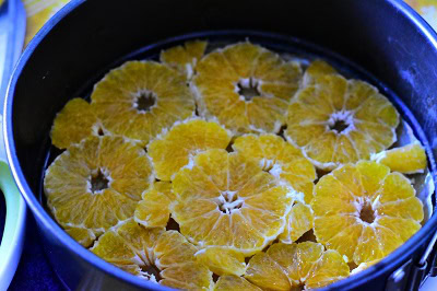 - Verser ce caramel dans le moule. Disposer des rondelle d'oranges. Prendre soin de bien couvrir la surface.