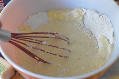 - Dans un autre saladier verser les ingrédients liquides (lait, oeuf, beurre fondu, zeste d'orange et extrait de vanille). Fouetter bien le tout.