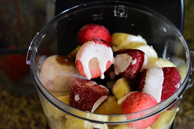 Le plus long pour cette glace a la fraise c’est l’attente de 3 heure au congélateur. Je ne rajoute pas de sucre a ma glace car les fraises le sont assez. On peut ajouter de l’extrait de vanille si désirée et 2 c-a-soupe de crème liquide afin de faciliter le mixage des fruits surgelés.