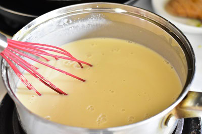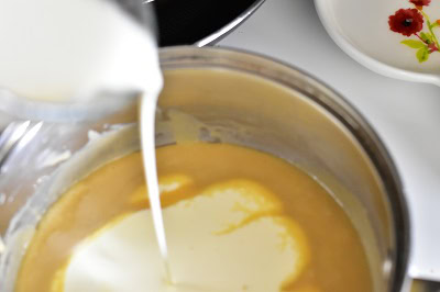 - Battre légèrement le jaune d'oeuf dans un bol. Verser délicatement environ 120 ml du liquide sur le jaune d'oeuf et mélanger.