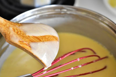 - Remettre le tout dans la casserole en remuant constamment jusqu'à ce que le mélange épaississe et recouvre le dos d'une cuillère en bois.