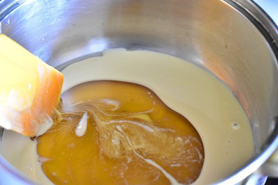- Dans une casserole, mélanger le miel et le tahini à feu moyen. Faites cuire jusqu'à ce que les bouillonnants, environ 5 minutes, ajouter la crème liquide et le lait et laisser cuire jusqu’à ce que le tout soit chaud.