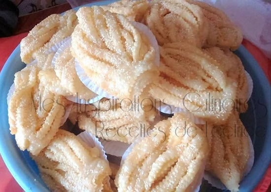 Piquer le bout de chaque bande avec une fourchette et rouler une fois. Plonger dans la friture et des que la pâte fait des bulles tourner comme un tourbillon et avec une autre fourchette serrer l’autre bout pour bien souder (une belle rose se formera ) retirer de la friture et laisser égoutter sur du papier absorbant.