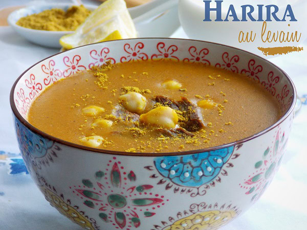 Harira, h’rira au levain (en arabe حريرة) est la soupe de la rupture du jeune durant le mois de ramadhan, elle est constituée de légumes secs, de viande et d’oignon, et du levain après tout dépend des régions on peut y ajouter des légumes ou pas. La Harira est accompagnée de datte, de bourek, maakouda et aussi et d’un bon pain maison.