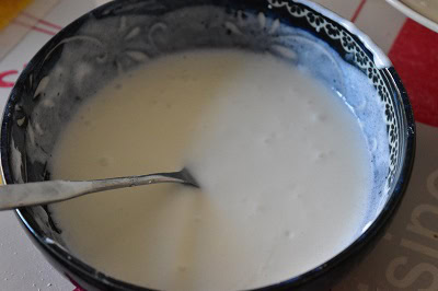 Dans un bol verser le yaourt, l’huile et un verre de le lait tiède mélangée à l’eau. Fouetter à l’aide d’une fourchette.