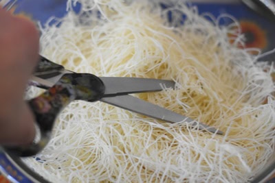 - Découper aux ciseaux (ou avec les doigts) la pâte Konafa en petits morceaux (environ 1 à 2 cm de long).