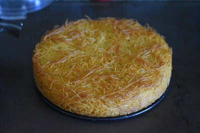 - Enfourner pendant 45 minutes environ ou jusqu'à ce que les bords soient dorés et le dessus légèrement doré (Si la surface ne colore pas allumer le grill du four en surveillant de près la coloration). Plus la cuisson est longue plus la Konafa est croustillante.