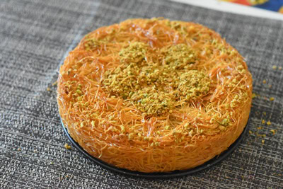 Laisser reposer 10 minutes afin de permettre au sirop de pénétrer puis retourner la Konafa sur une assiette de service. Parsemer de pistaches concassées.