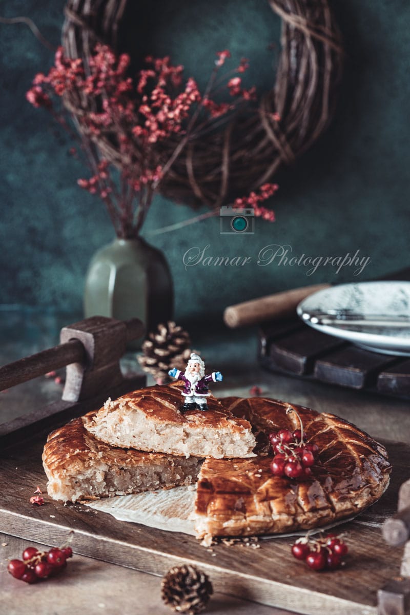 Composée de deux cercles de pâte feuilletée et fourrée d’une garniture à base de frangipane.
