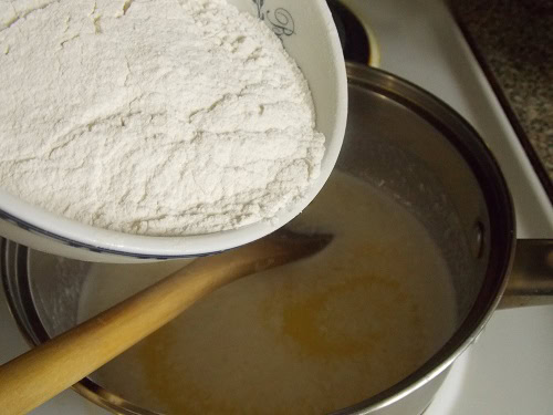 - Hors du feu, verser la farine en une seule fois et mélanger à l'aide d'une cuillère en bois.140 g farine