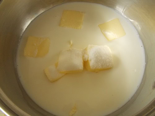 Pour commencer, dans une casserole portez à ébullition le lait, le sucre, le beurre et la pincée de sel.