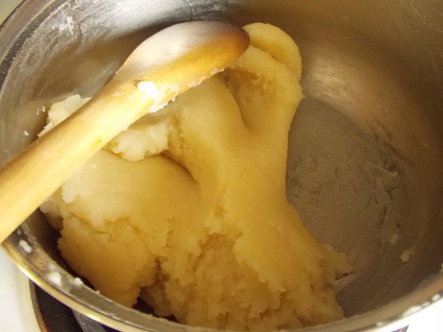 - Remettre sur le feu et remuer sans cesse jusqu’à ce que la pâte se détache des parois.