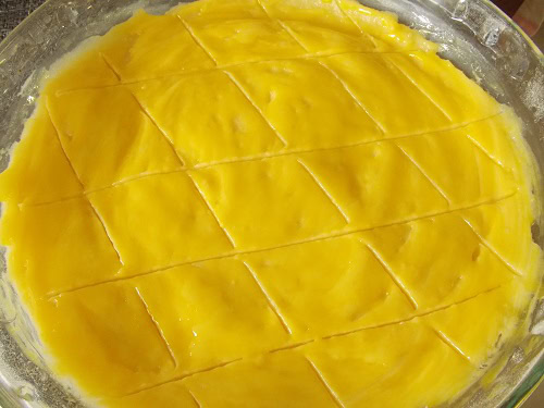 - Lisser la surface et badigeonner de jaune d'oeuf. Tracer des quadrillages a l'aide d'une fourchette.1 jaune d'oeuf
