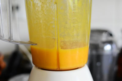 - Dans un blender réduire en purée les pêches dénoyautées, épluchées et coupées en tranche.