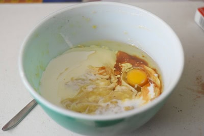 - Verser les ingrédients liquides aux ingrédients secs et mélanger jusqu’à incorporation totale (on obtient une pâte assez épaisse).
