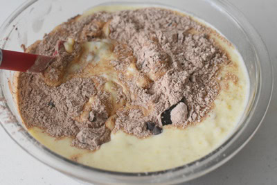 Verser les ingrédients liquides aux ingrédients secs et mélanger jusqu’à incorporation totale (on obtient une pâte assez épaisse).