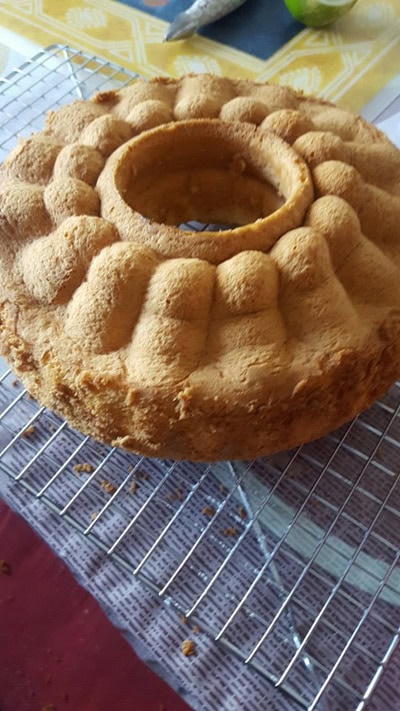 Pour ma part j’ai utilisé un moule ordinaire que j’utilise pour les bundt cake, j’ai beurré le fond jusqu’ici tout est bon j’ai retourné mon gâteau sur une bouteille et laissé refroidir complètement.