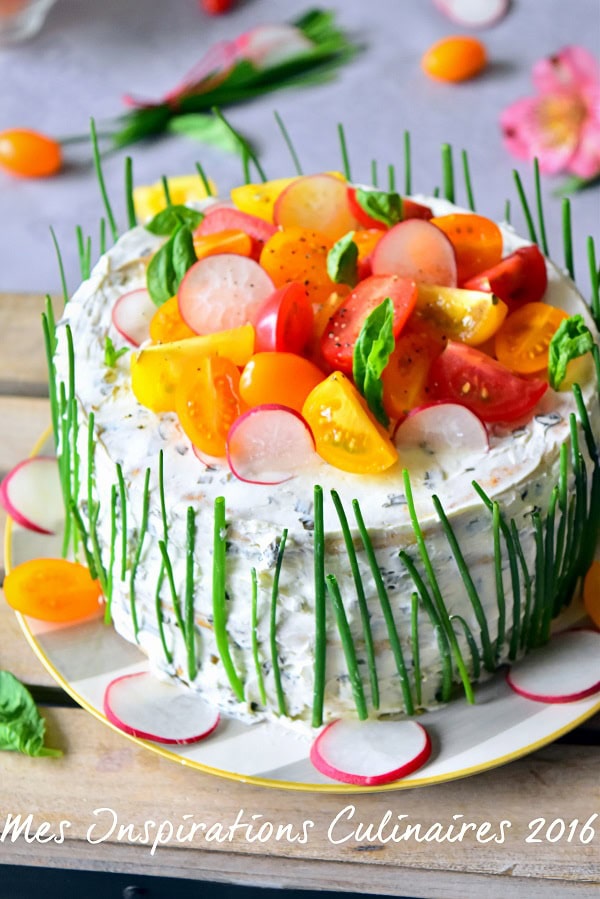 - Découper les tomates cerises en deux et déposer aléatoirement sur le cake ainsi que les rondelles de radis.