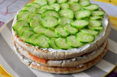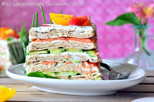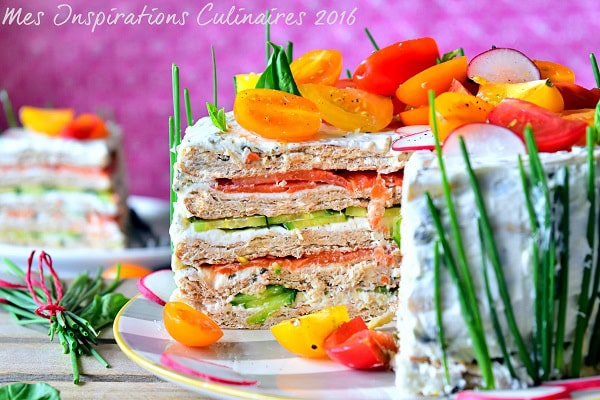 Le sandwich cake est un gâteau sandwich originaire de l’Irlande (Smörgåstårta) il est composé de pain, de fromage frais, de légumes et de crevettes ou saumon ou encore de la charcuterie. Dans mon cas des concombre, tomates, radis et saumon fumé.