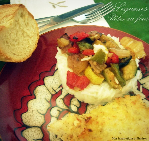 Vu que le soleil nous boude et que le froid reprend de plus belle, je voulais un plat pour égayer un peu nos assiettes. Donc pour bien finir la semaine j’ai préparé des légumes rôties au four que j’ai accompagné de riz Jasmin et d’un filet de poisson pané et cuit au four. Des légumes bien parfumés au thym et romarins frais c’est encore meilleur, et arrosés de vinaigre de balsamique et d’huile d’olive dans laquelle on laisse infuser une gousse d’ail.