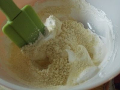 - Incorporer délicatement le mélange farine-amande aux blancs d'oeuf à l'aide d'une maryse ou spatule jusqu'à consistance lisse (ne surtout pas trop mélanger).