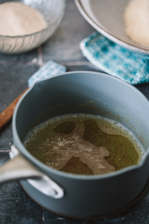 Une fois fondu, laissez-le refroidir à température ambiante. Ce détail est important : un beurre trop chaud pourrait cuire les jaunes d’œufs au moment de les mélanger.
