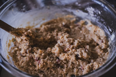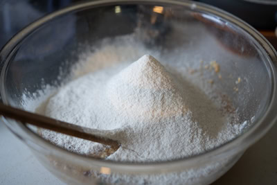 - Incorporez ensuite la farine tamisée avec le bicarbonate. Si vous trouvez que la pâte est trop ferme, ajoutez un peu de lait pour l'assouplir.