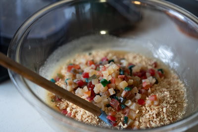 Retirez du feu et ajoutez les amandes, les épices ainsi que les fruits confits (et leur jus).