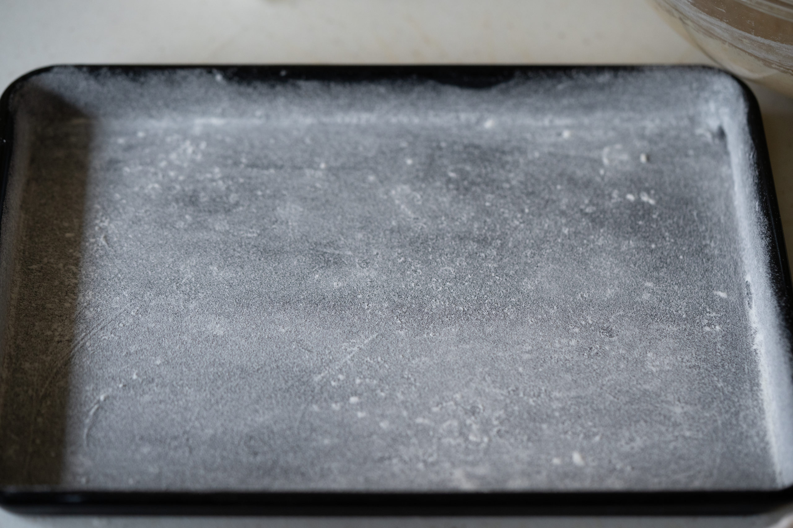 - Beurrez et farinez une plaque de cuisson (j'utilise une plaque rectangulaire de 25x18cm).