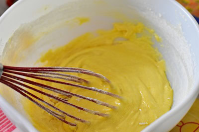 - Blanchir légèrement la préparation. Ajouter la farine mélangée à la levure en 3 fois.