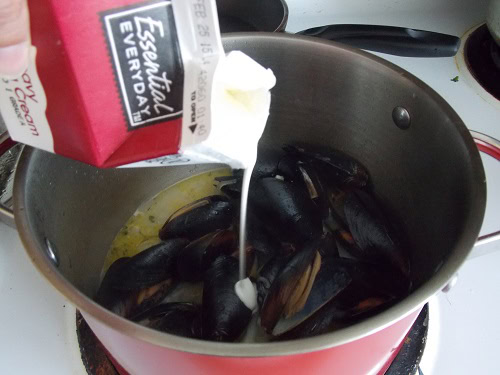 - Jeter les moules qui restent fermés. Ajouter la crème double et cuire pendant une minute supplémentaire. Ajouter le persil ciselé.