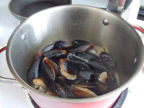 - Augmenter le feu et ajouter les moules, couvrir et cuire environ 3 minutes ou jusqu’à ce que les moules s'ouvrent (soulever le couvercle de temps en temps pour vérifier - vous saurez qu'ils sont cuits lorsque les coquilles sont ouvertes.