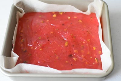 J’utilise un moule de 20x20 cm. Huiler et recouvrir de papier sulfurisé et huiler de nouveau.